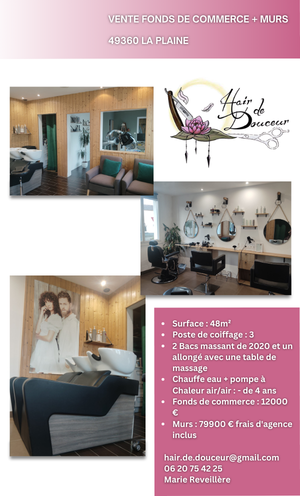 Fonds de commerce d’un salon de coiffure idéalement situé dans un village dynamique de 800 habitants, disposant d’une école, d’une épicerie et d’une boulangerie dans la commune de Fougeré 49150.